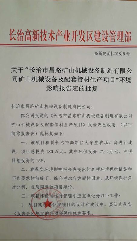 關(guān)于“長治市昌路礦山機(jī)械設(shè)備制造有限公司礦山機(jī)械設(shè)備及配套管材生產(chǎn)項目”環(huán)境影響報告表的批復(fù)